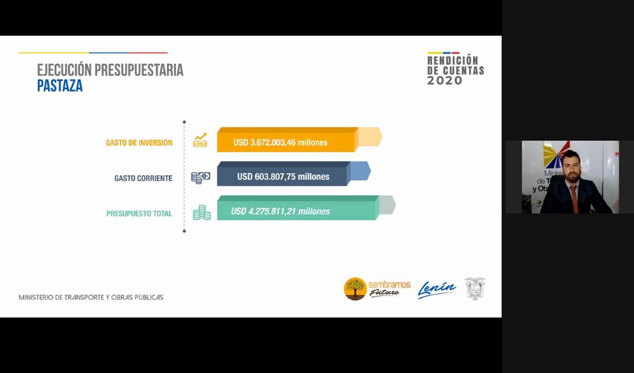 Cumpliendo con lo dispuesto en la Ley Orgánica de Participación Ciudadana de rendir cuentas a la ciudadanía, la Dirección Distrital de Pastaza del Ministerio de Transporte y Obras informó que el 80% de su red vial estatal está en buenas condiciones. En las obras que se ejecutaron durante el 2020 tuvieron un presupuesto de USD 4´275.811 para el mantenimiento de la red vial estatal de 139,20 kilómetros.