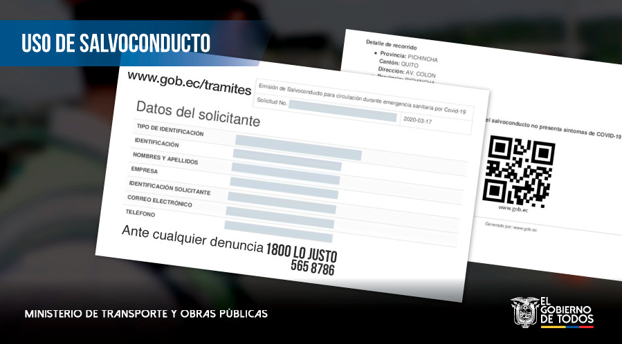 El Ministerio de Transporte y Obras Públicas informa que el salvoconducto emitido el 24 de marzo de 2020, que puede ser descargado en el portal www.gob.ec, es el único documento autorizado para la excepción de la restricción a la movilidad vehicular y toque de queda (de 14:00 a 05:00 en todo el país).