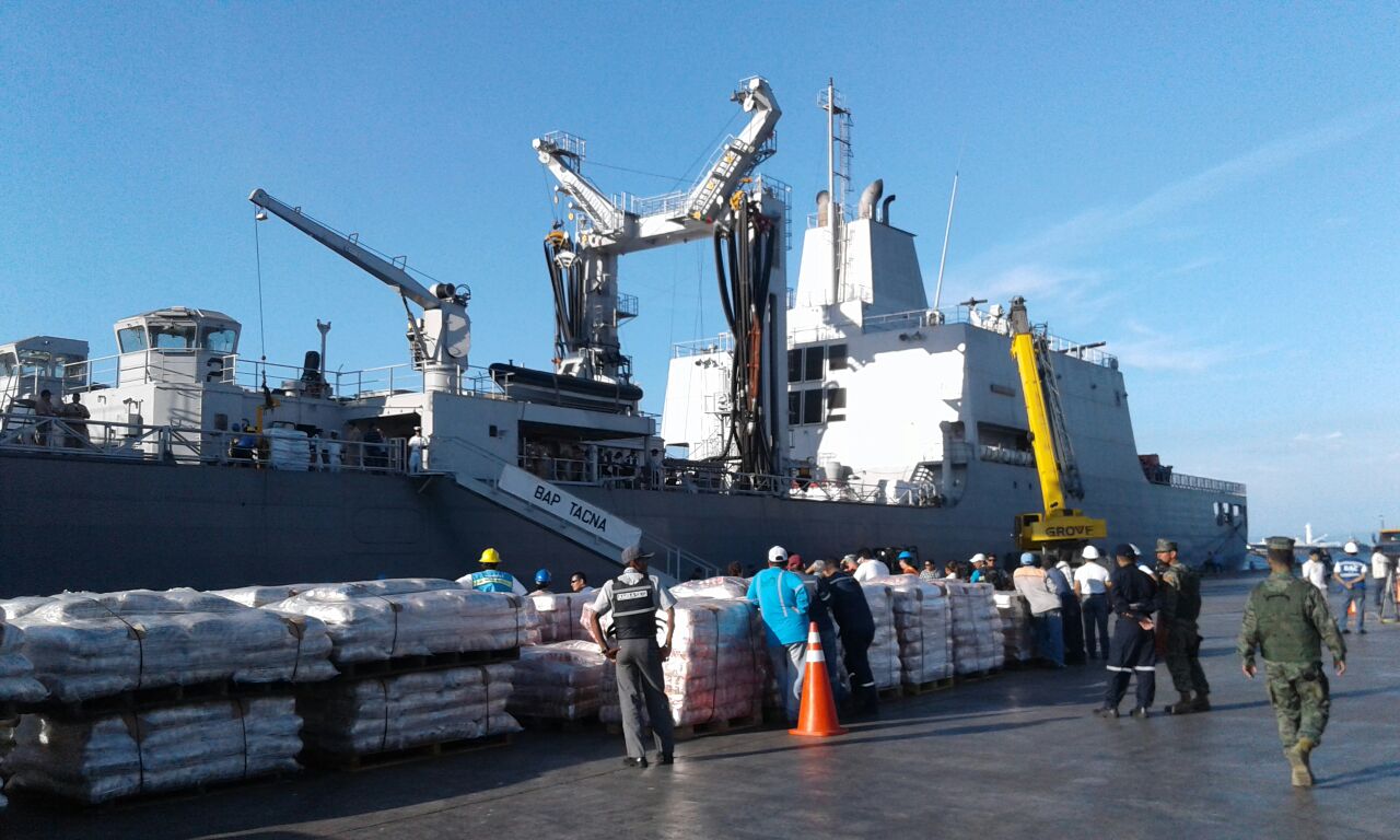 El barco BAP TACNA, el más grande de la Armada del Perú, es la segunda embarcación de ese país que llega con ayuda humanitaria, pues el pasado martes (26) también atracó el BAP CALLAO, con maquinaria: tractor sobre orugas, excavadora hidráulica, tractor sobre ruedas, volquete, jeep wrangler, 200 mil galones de agua y personal técnico (ingenieros), quienes se sumaron a los trabajos de remoción de escombros en los lugares del desastre.