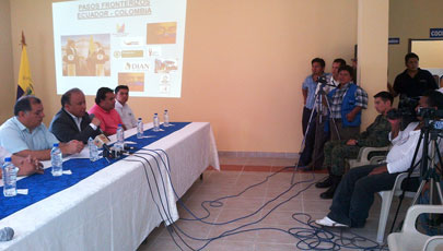 A través de una Rueda de Prensa ofrecida por el Subsecretario de Transporte Terrestre y Ferroviario, Ing. Alex Pérez y sustentada con las intervenciones de varios delegados de las entidades de control del Centro Binacional de Atención Fronteriza San Miguel, se dio a conocer las bondades de la legalización del paso de frontera entre Ecuador y Colombia, en la provincia de Sucumbíos.