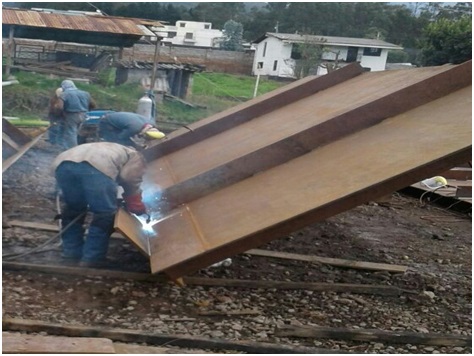Obreros del MTOP armando vigas metálicas para el puente sobre el río Lulo