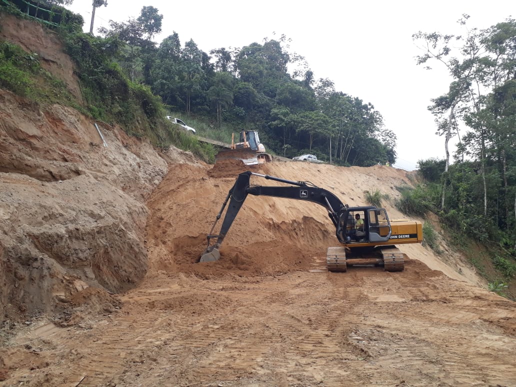 Las labores de reconformación de la estructura del talud, para recuperación de la vía, se ejecutan con personal técnico del MTOP, maquinaria pesada (dos excavadoras grandes, un tractor, un rodillo, dos volquetes) y con la colaboración de los trabajadores de las Asociaciones de Conservación Vial.