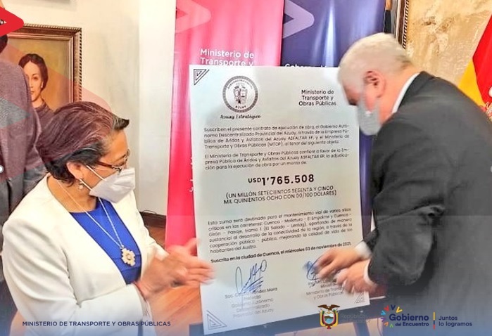 En el marco del 201 aniversario de independencia de Cuenca, Marcelo Cabrera, ministro de esta cartera de Estado y Cecilia Méndez, prefecta del Azuay, suscribieron un documento simbólico por los dos contratos. Esta inversión responde a la necesidad de fortalecer la conectividad vial del Austro del país, tal como se ha comprometido el Gobierno del Encuentro.