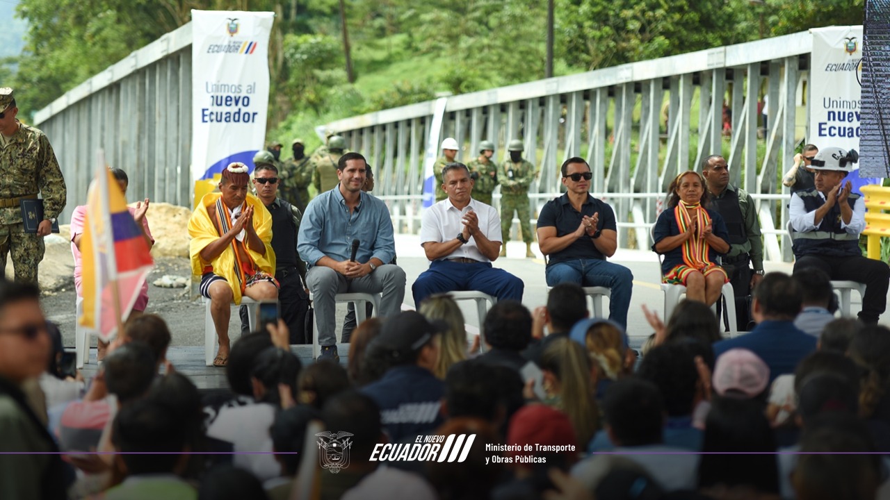 En febrero de este año, la fuerte crecida del río provocó el colapso del puente, impidiendo el tránsito vehicular. De forma inmediata, el presidente Noboa dispuso la colocación de un puente provisional para restituir la conectividad clave para el turismo y el transporte de productos de primera necesidad en el país. Esta es una de las principales arterias viales que conecta la Sierra y la Costa y por la que circulan cerca de 12.000 vehículos diarios.