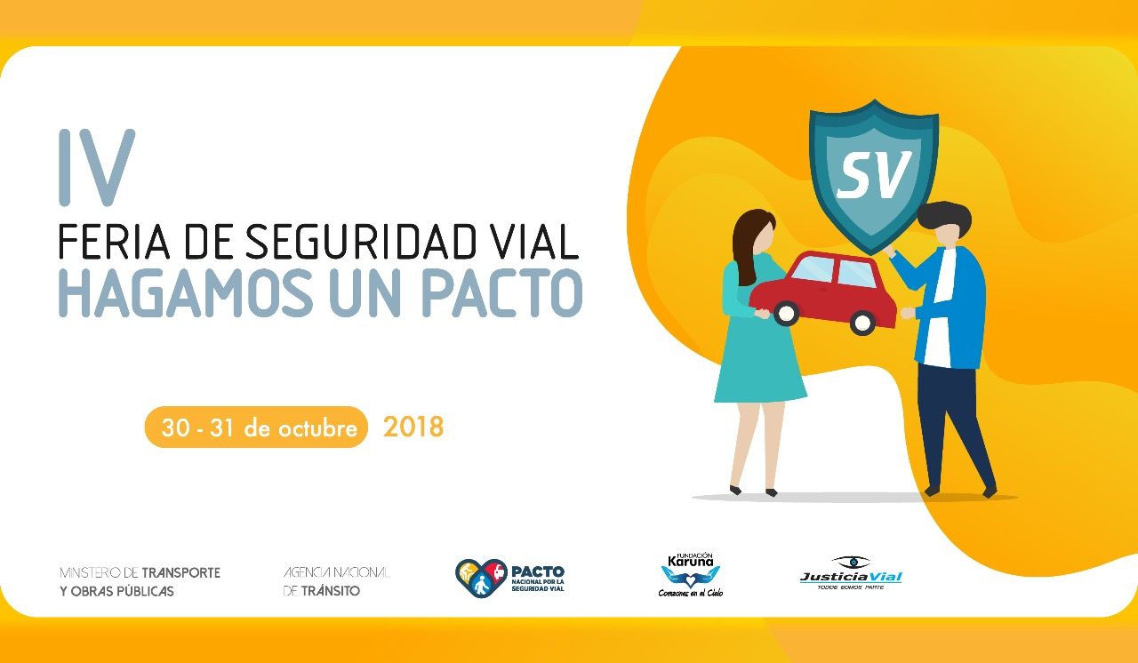 Una vez más promueve el trabajo coordinado entre instituciones públicas, privadas, entidades de control de tránsito y organizaciones sociales. Sea parte del Pacto Nacional por la Seguridad Vial y participe en la IV Feria de seguridad vial “Hagamos Un Pacto”, que se realiza los días 30 y 31 de octubre, de 9:00 a 17:00 en el Centro de Exposiciones Quito.