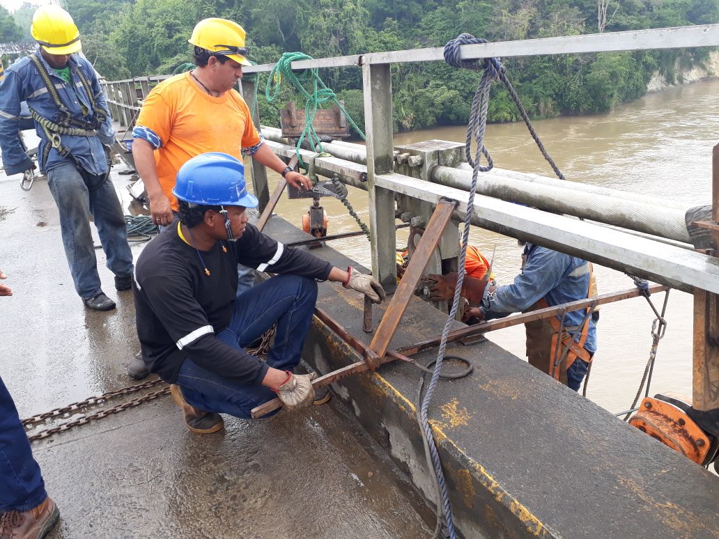 Con una inversión de más de 58 000 dólares, se trabaja en el cambio de las péndulas dañadas y de pernos, además del arreglo de fisuras en las vigas en el interior del puente. Se estima culminar los trabajos en 30 días y una vez cumplido este procedimiento, se permitirá el paso de vehículos livianos, hasta tener una evaluación estructural final del puente.