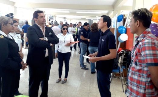 El director ejecutivo de la Comisión de Tránsito del Ecuador, Eduardo Ayala, visitó cada uno de los stands junto a la comandante del Cuerpo de Vigilantes, Aracely Hernández, y expresó a los estudiantes de esta escuela, que bordea los 1200 futuros conductores profesionalizados, “que es una garantía saber que se preparan con un mayor sentido de concienciación por la seguridad vial”.