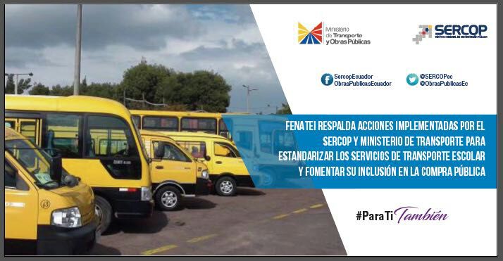 Desde junio de 2015 la Federación Nacional de Transporte Escolar e Institucional del Ecuador (FENATEI) ha trabajado con el SERCOP para incluir a sus 12.368 agremiados en los Catálogos Inclusivos, porque a través de este mecanismo se garantiza: 1) la contratación de unidades con los respectivos permisos de operación y circulación; 2) adecuados precios de contratación que eliminan la intermediación e impiden la subcontratación; y, 3) estandarización de los servicios de transporte escolar.