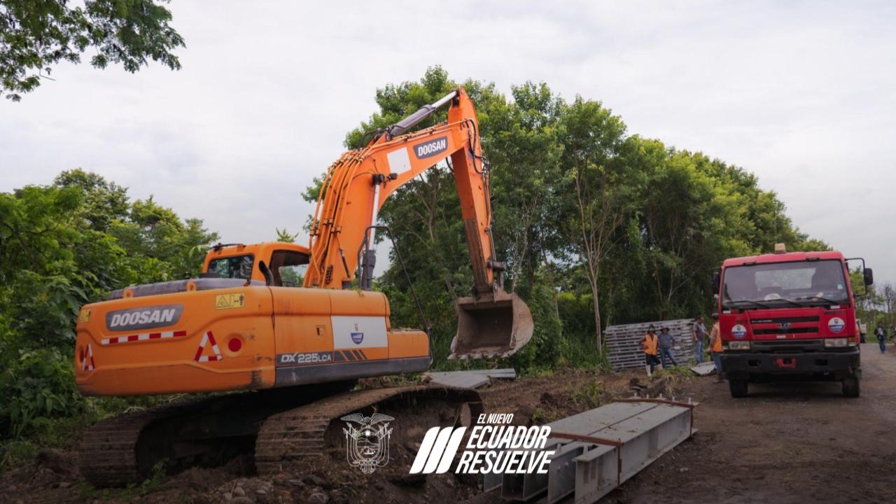 El trabajo que estamos realizando en este momento por parte del personal y maquinaria del MTOP, son la reconformación de taludes y posteriormente se realizará la protección de los muros de escolleras. Finalmente se procederá al armado y el lanzamiento del puente en este mismo sitio.