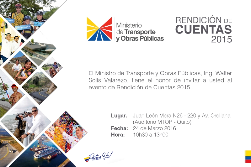 El Ministro de Transporte y Obras Públicas, Ing. Walter Solís Valarezo, en cumplimiento con lo que establece la Ley Orgánica de Participación Ciudadana en su Art. 89, que, entre otras cosas señala la obligación de informar y someterse a evaluación de la ciudadanía por las acciones u omisiones en el ejercicio de su gestión y en la administración de recursos públicos, realiza su Rendición de Cuentas 2015.
