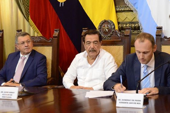 El ministro de Transporte y Obras Públicas, Aurelio Hidalgo, fue testigo de honor de la suscripción del contrato para la profundización del canal de acceso marítimo desde la boya de mar hasta las terminales portuarias de Guayaquil. El acto se celebró entre el Municipio de Guayaquil y la empresa belga Jan De Nul, luego de que el MTOP delegara esta facultad a la Municipalidad, mediante un trabajo articulado.