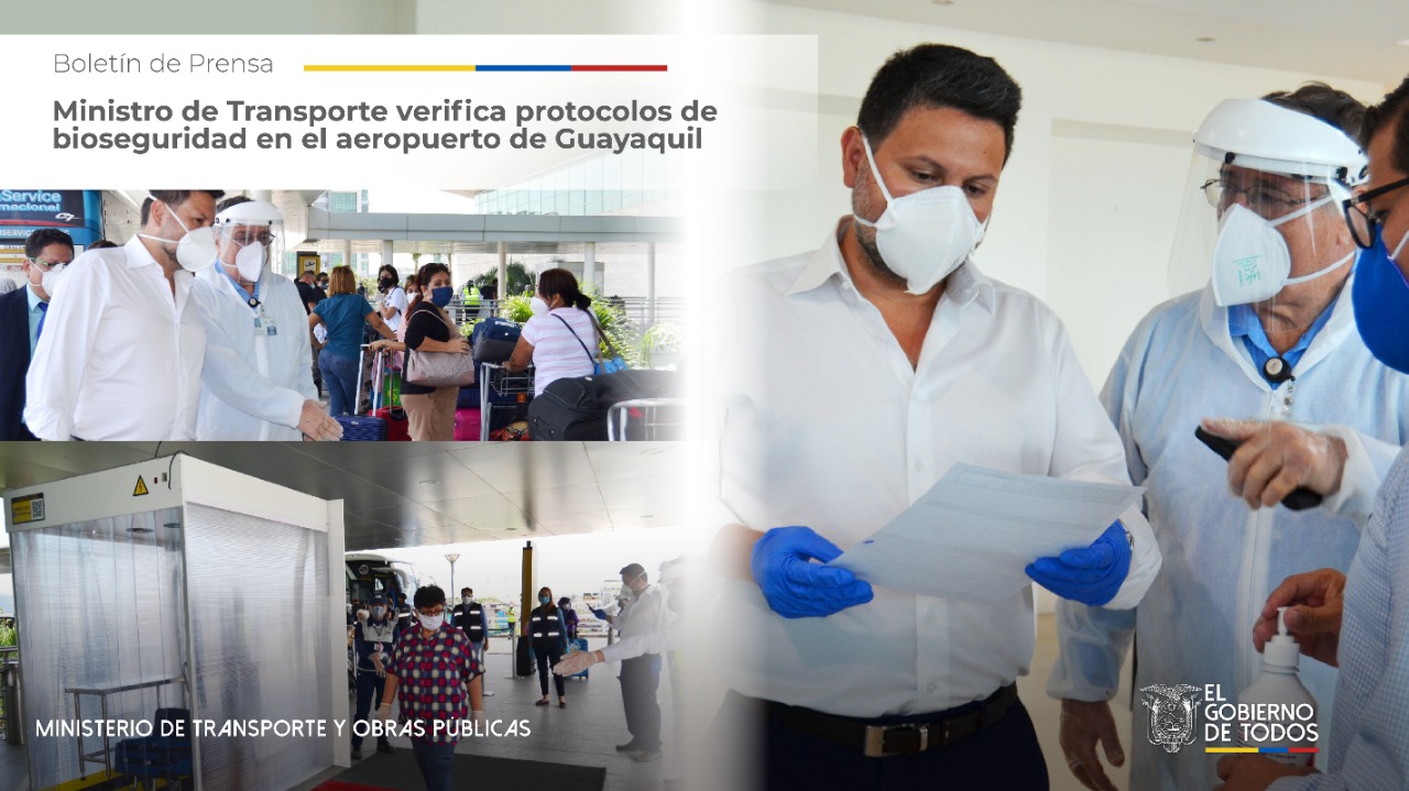 El ministro de Transporte y Obras Públicas, Gabriel Martínez, inspeccionó, el 18 de mayo de 2020, los procedimientos establecidos en el aeropuerto internacional José Joaquín de Olmedo, de Guayaquil como parte de los protocolos de bioseguridad que se aplicarán en la reapertura de las operaciones aéreas de pasajeros en el país que tentativamente podría darse a partir del 1 de junio próximo.