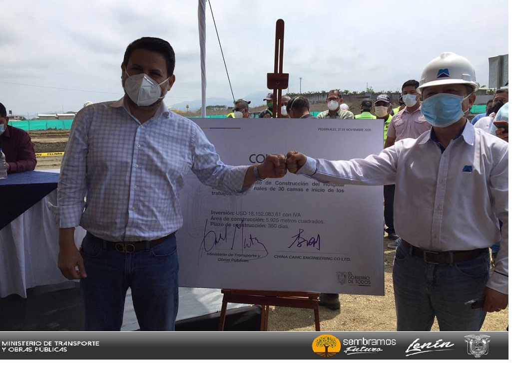 El ministro de Transporte y Obras Públicas, Gabriel Martínez, firmó hoy 27 de noviembre de 2020, el contrato para la construcción del Hospital Básico de Pedernales de 30 camas, con la empresa pública China CAMCE Engineering, por un monto que supera los USD 18 millones. La obra se efectuará en un plazo estimado de 360 días.