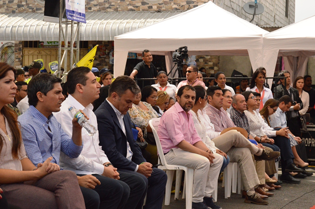 Ministro de Transporte y Obras Públicas, Dr. Paúl Granda durante la entrega de créditos, junto a otros Secretarios de Estado.