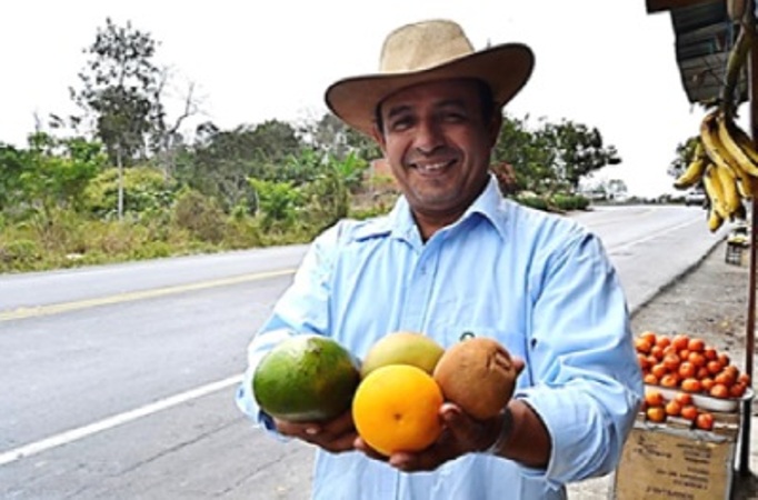 El agricultor y comerciante Kleber Intriago ofrece mamey, naranja, aguacates y mangos en el tramo Canuto – Calceta.