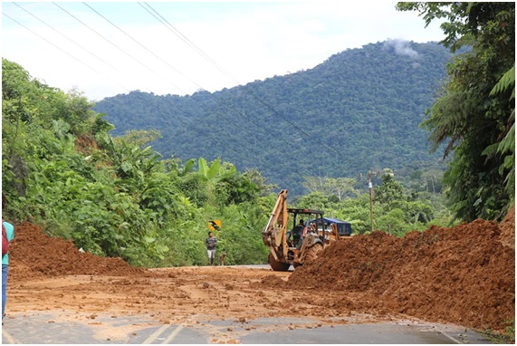 Maquinaria del Ministerio de Transporte y Obras Públicas (MTOP) que se encuentra en este corredor vial desde hace varias semanas, trabaja en la remoción de los deslizamientos a fin de abrir camino y llegar al km 62.