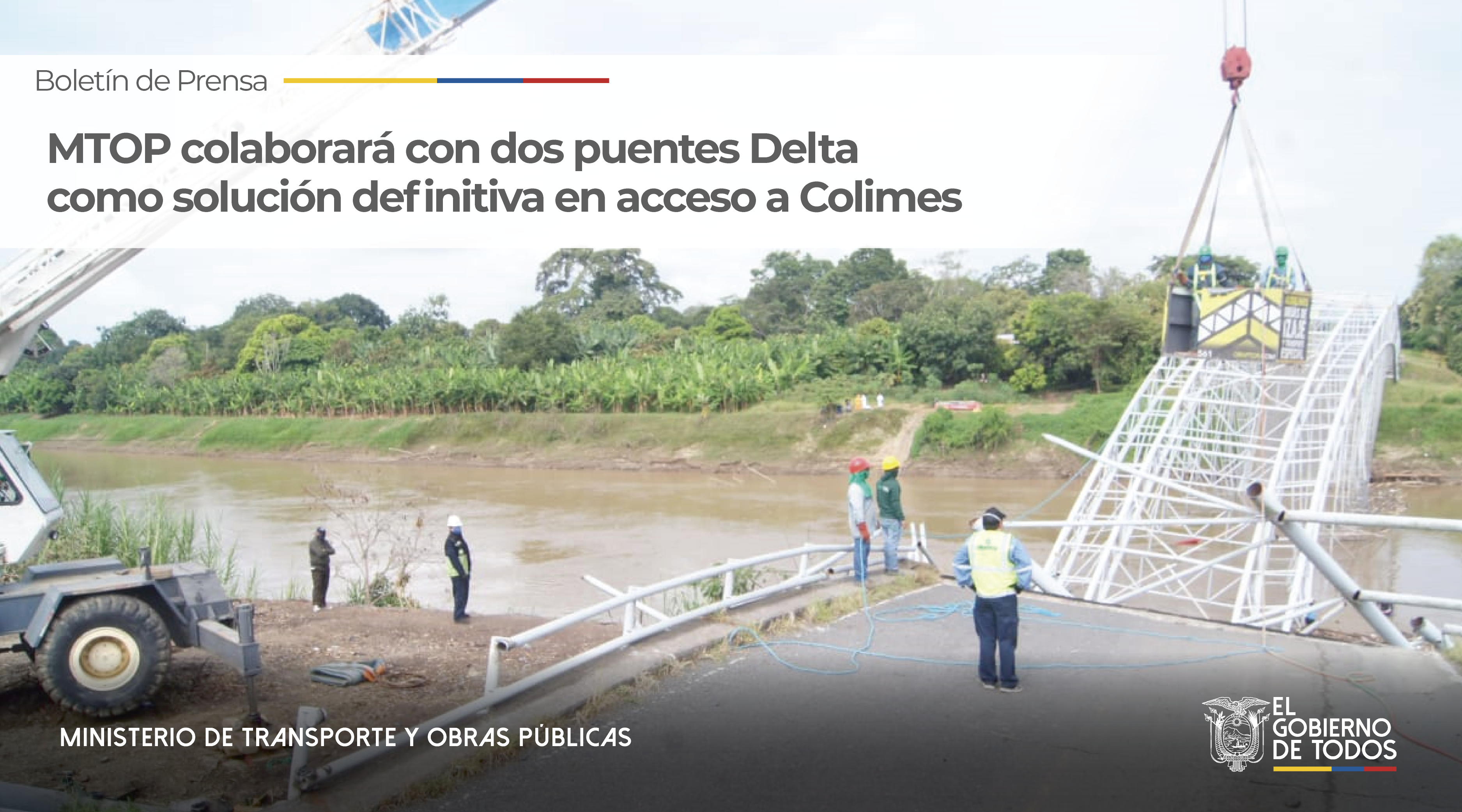 Como solución definitiva ante la caída del puente de acceso a Colimes, el Ministerio de Transporte y Obras Públicas (MTOP), mediante convenio de cooperación interinstitucional que suscribirá con la Prefectura del Guayas, proveerá dos puentes Delta de 70 metros de longitud cada uno. Así lo anunció la mañana de este lunes 27 de abril, el titular de esta cartera de Estado, Gabriel Martínez, durante el recorrido en el cantón.