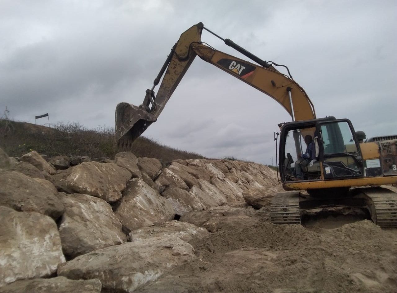 Equipo caminero ejecuta labores de colocación de bloques de piedra para reforzar la franja costera.