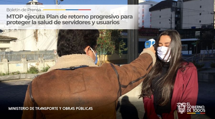 En cumplimiento de las normas emitidas por el Comité de Operaciones de Emergencia (COE) Nacional, el Ministerio de Transporte y Obras Públicas (MTOP) ejecuta el “Plan de retorno progresivo al trabajo”, con el objetivo de precautelar la seguridad de servidores, trabajadores y usuarios externos en todo el territorio nacional.