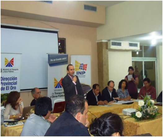 Becerra dio la bienvenida a los expositores José Chacón y Manuel Jódar Casanova, especialistas en ingeniería de caminos, canales y puertos. Además agradeció la participación de los representantes de la Universidad Técnica de Machala; del Colegio de Ingenieros Civiles de El Oro; de los Municipios de Piñas, Portovelo y Zaruma; y, a las delegaciones de las direcciones provinciales del MTOP El Oro, Loja y Zamora Chinchipe.