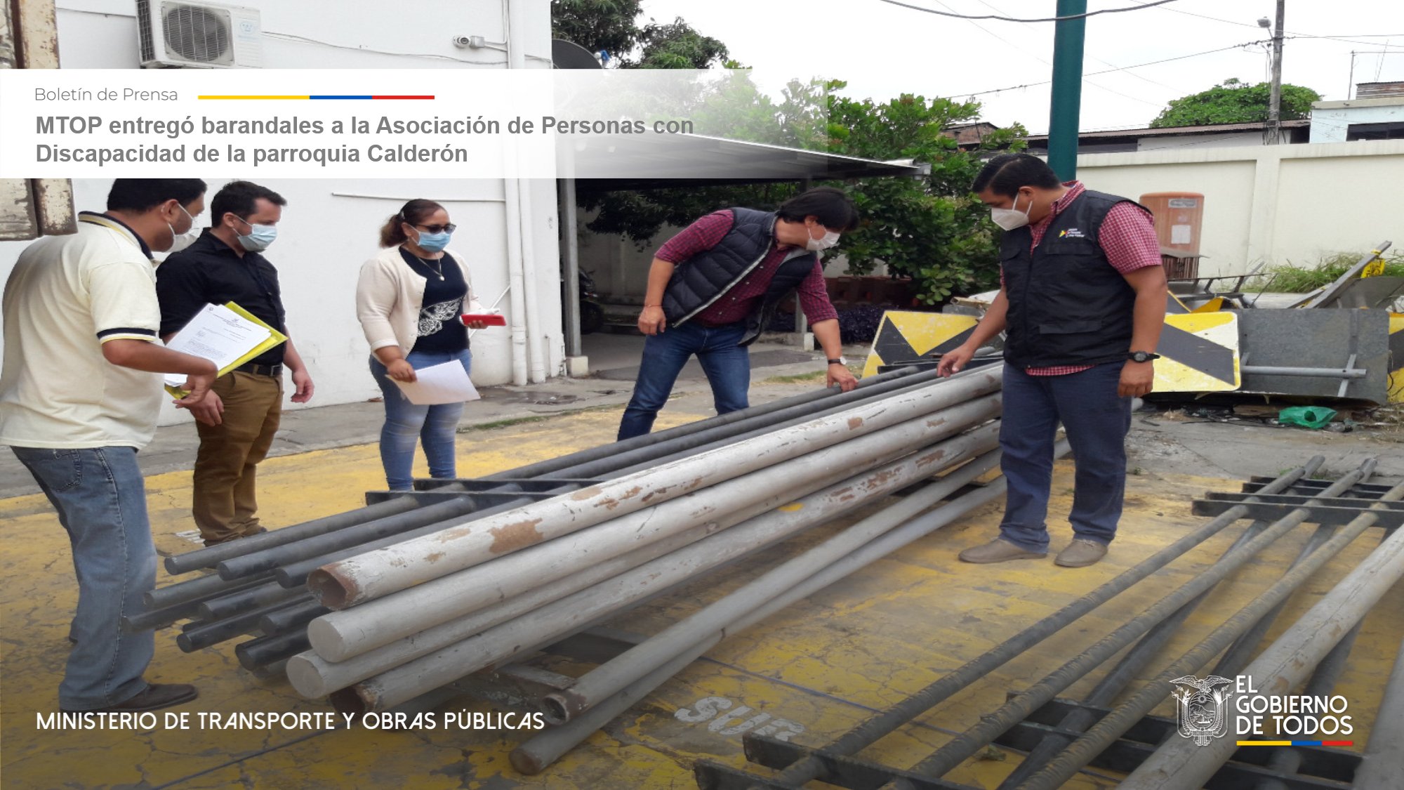 El Ministerio de Transporte y Obras Públicas (MTOP) a través de la dirección distrital de Manabí, entregó 88 metros lineales de barandas metálicas a la Asociación de Personas con Discapacidad de la parroquia Calderón, cantón Portoviejo, provincia de Manabí.