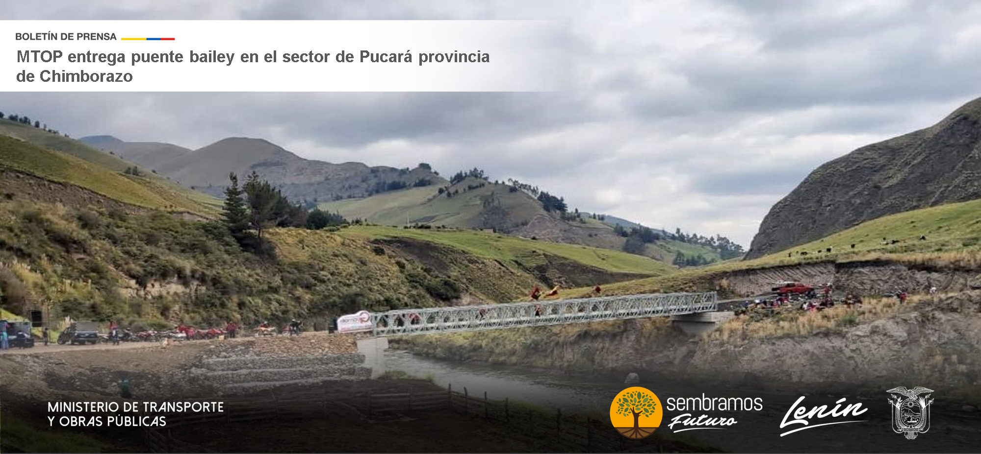 El viceministro de Infraestructura del Transporte, Ricardo Paula, en representación del ministro de Transporte y Obras Públicas, Gabriel Martínez, participó en la entrega del puente bailey de 45 metros de longitud, colocado en el sector de Pucará (El Tingo), parroquia Cebadas. La obra mejorará la calidad de vida de aproximadamente 6000 habitantes de varias comunidades de la provincia de Chimborazo.