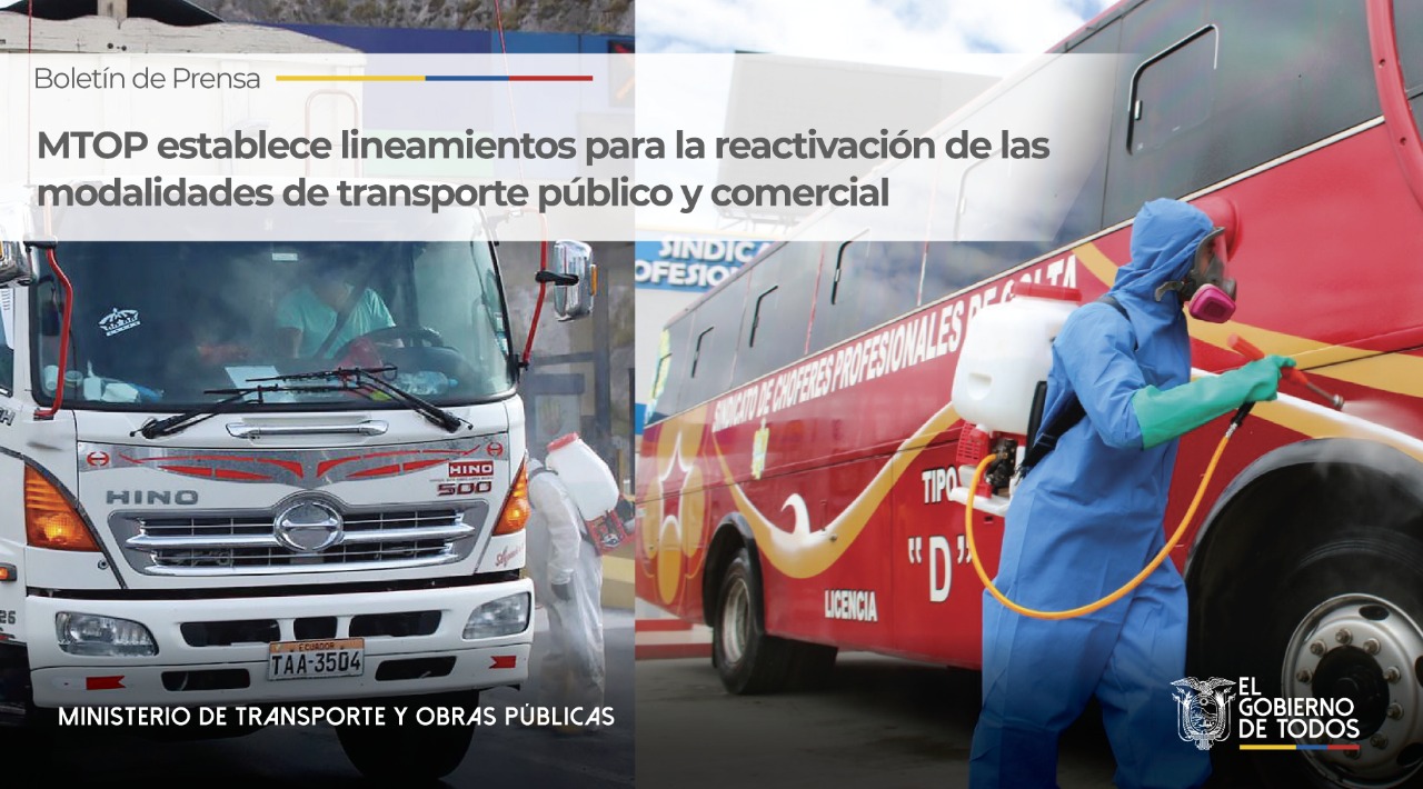 El Ministerio de Transporte y Obras Públicas (MTOP) con el objetivo de poner en marcha al sector del transporte, eje fundamental para el desarrollo logístico y productivo del país, solicitó al Comité de Operaciones de Emergencia (COE) Nacional, la aprobación de la Guía de movilidad urbana sostenible y Protocolos de transporte público interprovincial e intraprovincial, carga liviana y mixta, taxi convencional y ejecutivo, escolar e institucional, y turístico que contienen los lineamientos para la operación de los servicios de forma ordenada y segura durante la fase de semaforización.