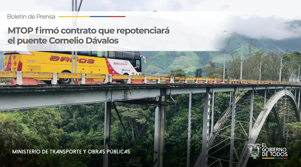 El Ministerio de Transporte y Obras Públicas, cumpliendo las disposiciones del Gobierno Nacional, firmó el contrato para la repotenciación y mejoramiento del puente Cornelio Dávalos -conocido como Sal Si Puedes-, ubicado en la carretera Balbanera – Pallatanga – Cumandá, por donde transitan alrededor de 3.500 vehículos diarios y que conecta a las provincias de Chimborazo y Guayas.