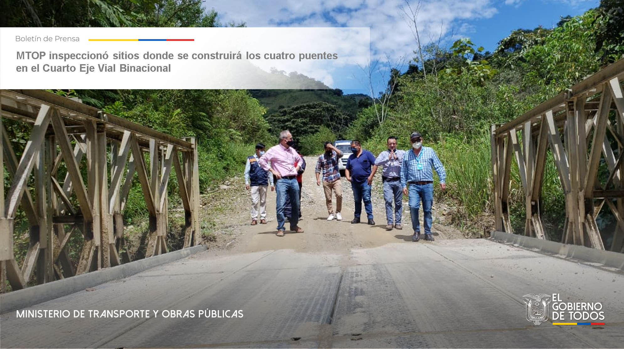 Previo a la construcción de los cuatro puentes: Quebrada Honda de 35 metros, Palanda de 60, Agua Dulce de 60 y Palanumá de 80 metros, ubicados en el Cuarto Eje Vial, tramo I: Vilcabamba – Palanda – Bellavista, los funcionarios del Ministerio de Transporte y Obras Públicas (MTOP): Fredy Altamirano Arias, subsecretario Zonal 7, y Jesús Lugmaña, director distrital de Zamora Chinchipe, realizaron una inspección técnica en los sitios donde se cimentarán las estructuras.