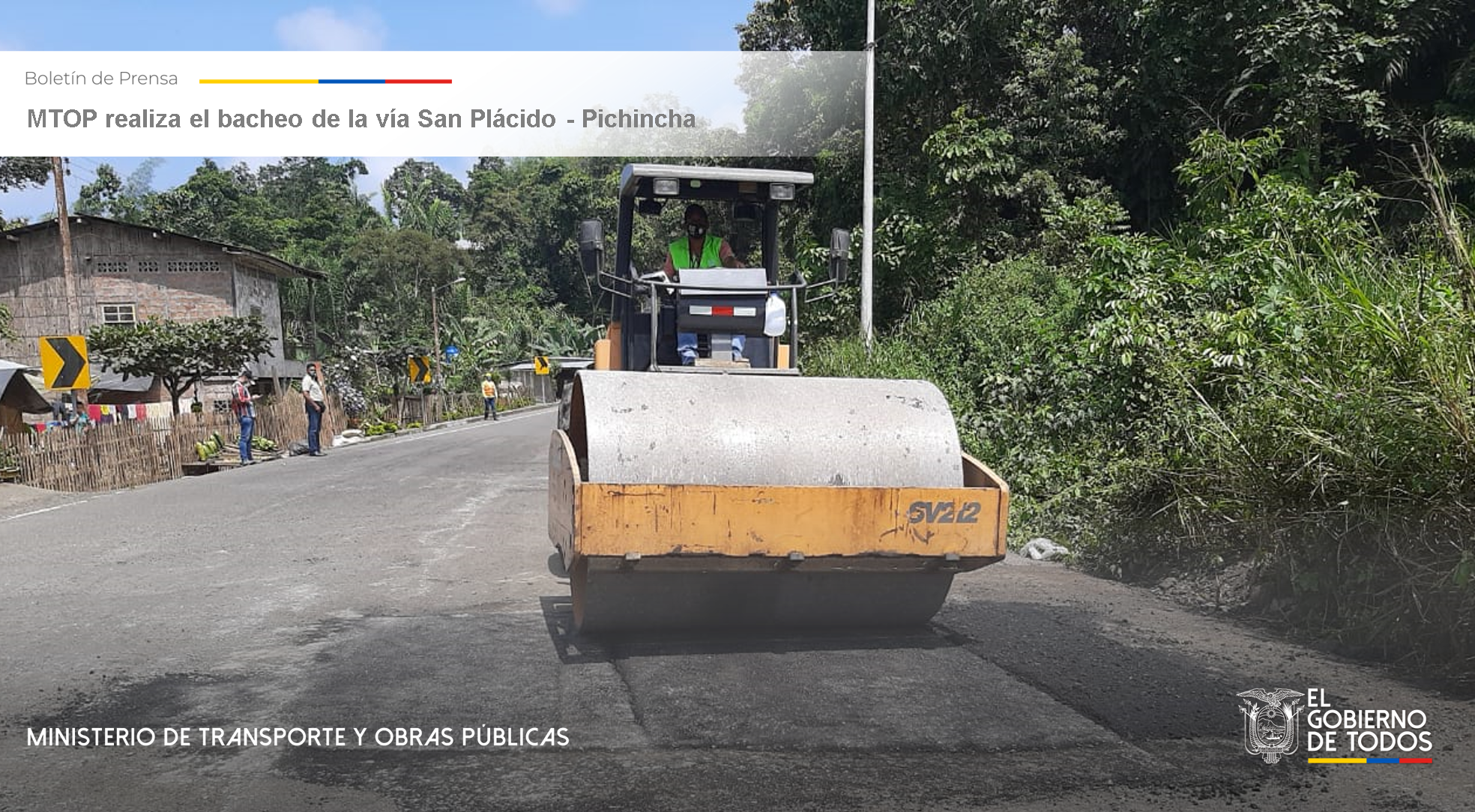 Desde el 29 de julio pasado, el Ministerio de Transporte y Obras Públicas (MTOP) realiza el bacheo en frío, desde el kilómetro 43 de la vía San Plácido – Pichincha, en una longitud aproximada de 10 kilómetros, con el objetivo de cubrir los agujeros a causa de la humedad en la zona, y brindar mayor seguridad a los usuarios de esta importante arteria manabita.