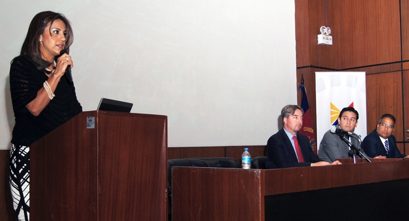 Durante el taller, la Ing. Delia Guerra, Asesora de Logística del MTOP, da la bienvenida a las empresas privadas y explica la misión del Ministerio respecto a la optimización de procesos logísticos y al compromiso de brindar un servicio de calidad al exportador y a la ciudadanía.