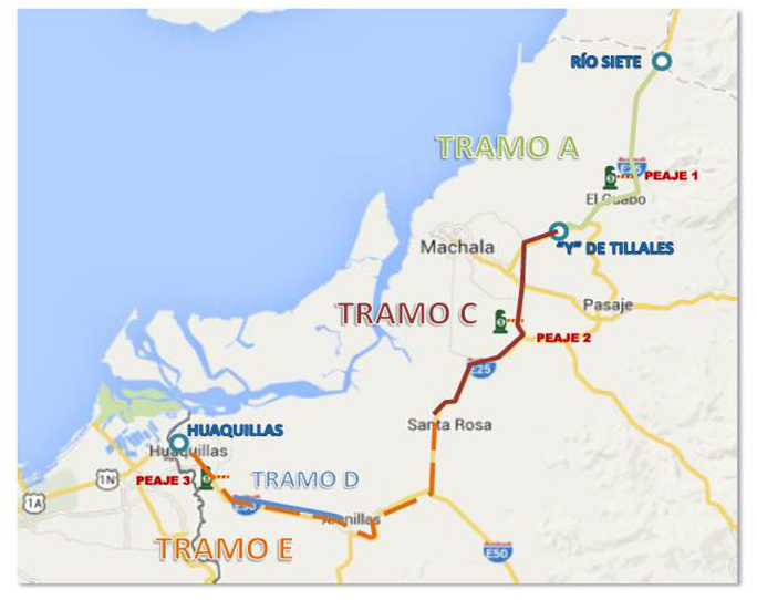 La vía Río Siete – Huaquillas, tiene una longitud de 95 km, será adecuada para que cumpla con las características de una vía de alta capacidad, de cuatro y seis carriles e incluya soluciones viales a desnivel y accesos controlados.
