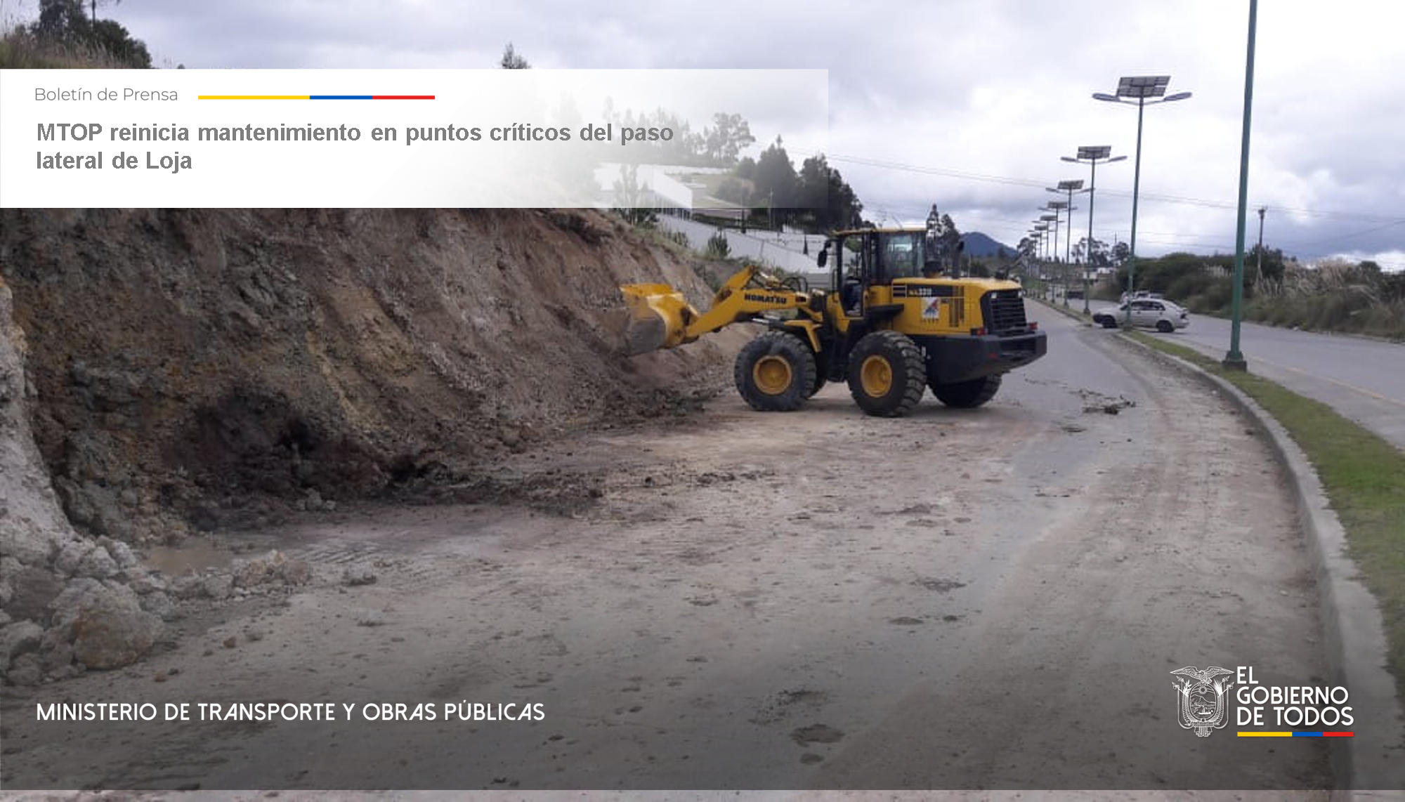 Del 3 al 7 de agosto de 2020, equipo técnico y maquinaria del Ministerio de Transporte y Obras Públicas (MTOP) efectúa la limpieza de derrumbes menores en el paso lateral de Loja, sector de Carigan y sitio Los Operadores, junto a los predios de la Funeraria Jaramillo, informó Fredy Altamirano Arias, subsecretario Zonal 7.