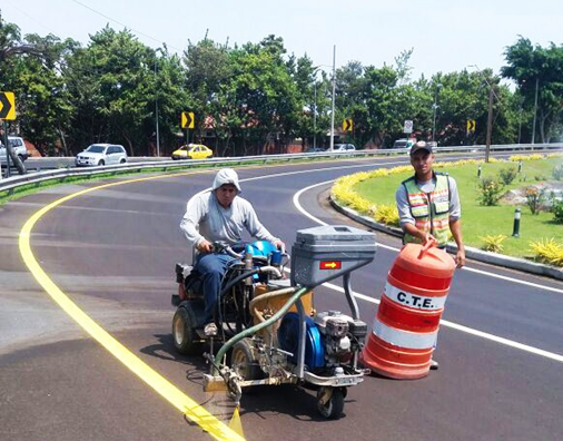 - En los trabajos de señalización horizontal se utilizan máquinas franjadoras de la CTE y se aplica pintura acrílica, proporcionada por el MTOP, con la finalidad de precautelar la seguridad en las carreteras.