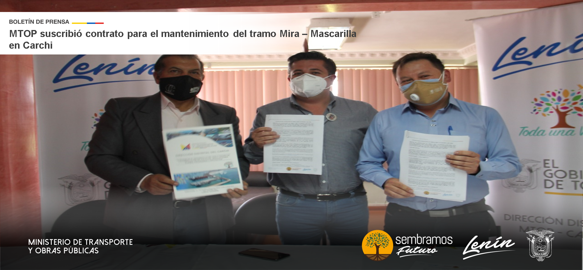 El director distrital del Ministerio de Transporte y Obras Públicas (MTOP) del Carchi, Renán Benavides, suscribió el contrato para el mantenimiento de la vía E-187, tramo Mira – Mascarilla de 15 Km de longitud, con el contratista tulcaneño Pablo Becerra, por un monto de USD 342.982. Oscar Ruano, gobernador de la provincia, participó como testigo de honor de la firma.