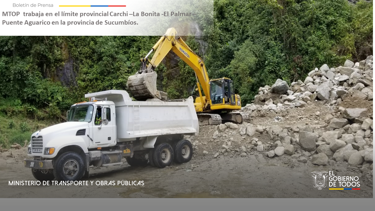 El Ministerio de Transporte y Obras Públicas, a través de la Dirección Distrital de Sucumbíos, informa que continúan los trabajos de mejoramiento de la carretera en el eje interprovincial que une Carchi y Sucumbíos, en los tramos Julio Andrade – La Bonita –el Palmar –Puente Aguarico, RVE- E45 perteneciente a la red vial Estatal.