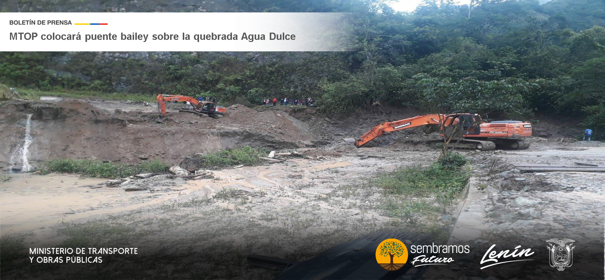 El Ministerio de Transporte y Obras Públicas (MTOP) limpia la vía y trabaja en las plataformas (bases) para el armado y colocación de un puente bailey de 24 metros de longitud, que se prevé llegará en las próximas horas, informó Danny Ocampo Veintimilla, director distrital del MTOP Zamora Chinchipe.