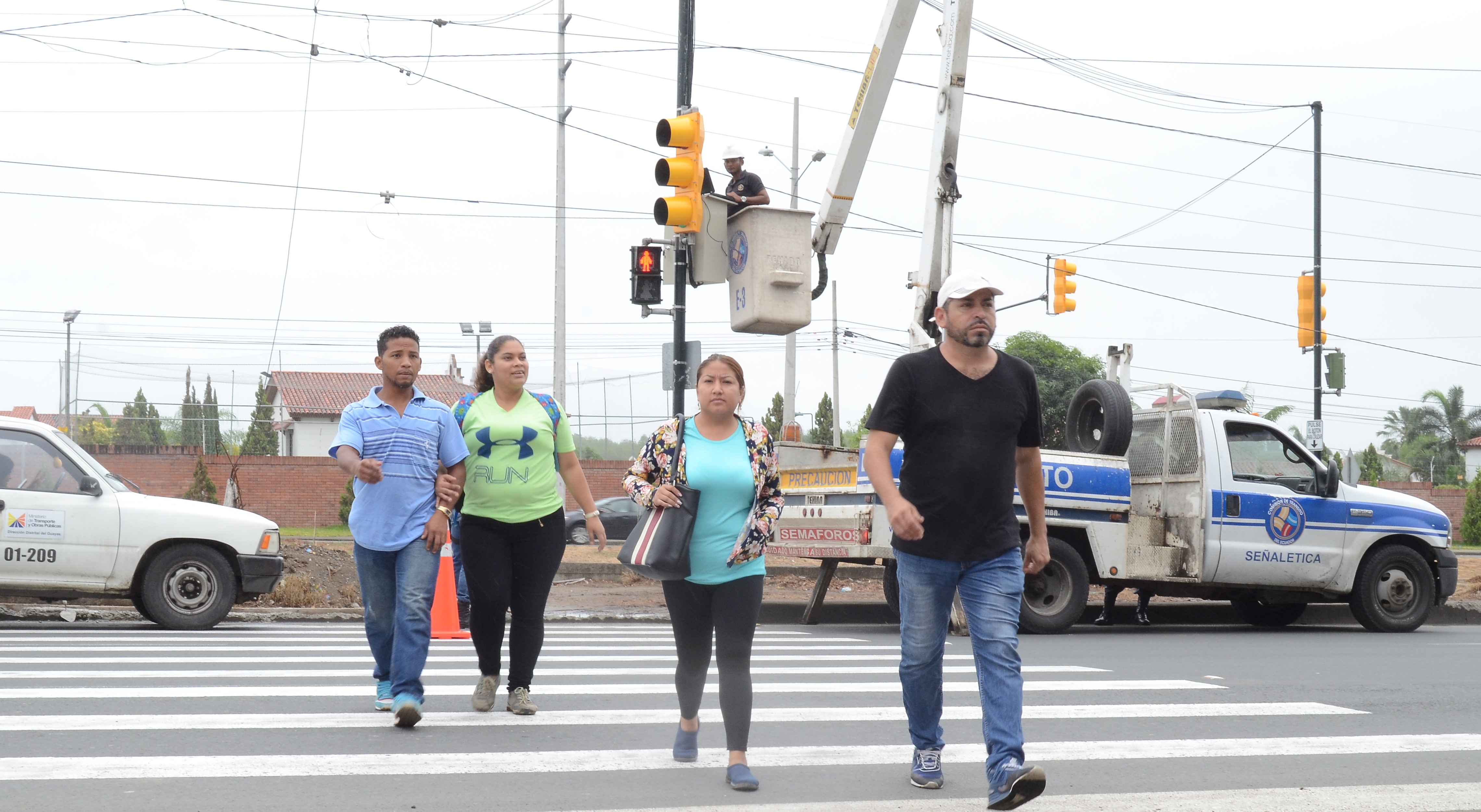 Ciudadanía hace uso de semaforización peatonal, a la altura de Mi Comisariato, en la vía a la Costa.