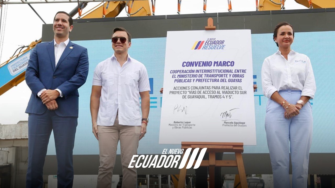 Guayas. – En el marco de la Sesión Solemne por los 204 años de provincialización del Guayas y con la presencia del presidente de la República del Ecuador, Daniel Noboa, como testigo de honor, el ministro de Transporte y Obras Públicas, Roberto Luque y la prefecta Marcela Aguiñaga, firmaron el Convenio Marco de Cooperación Interinstitucional para realizar el proyecto denominado “Vías de Acceso al Viaducto Sur de Guayaquil, tramos 4 y 5”, la mañana del viernes 08 de noviembre de 2024.