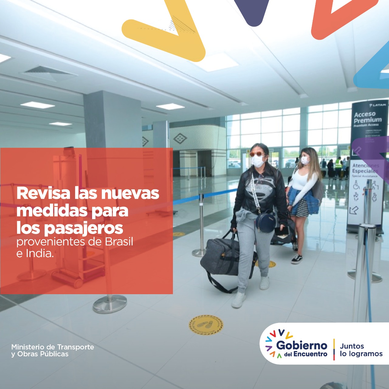 En este contexto, todos los pasajeros cuyo punto de origen, escala o tránsito sea Brasil e India deben presentar un resultado negativo de la prueba RT-PCR con vigencia de 72 horas previas al embarque. Este requisito es obligatorio, independientemente si los viajeros están vacunados.