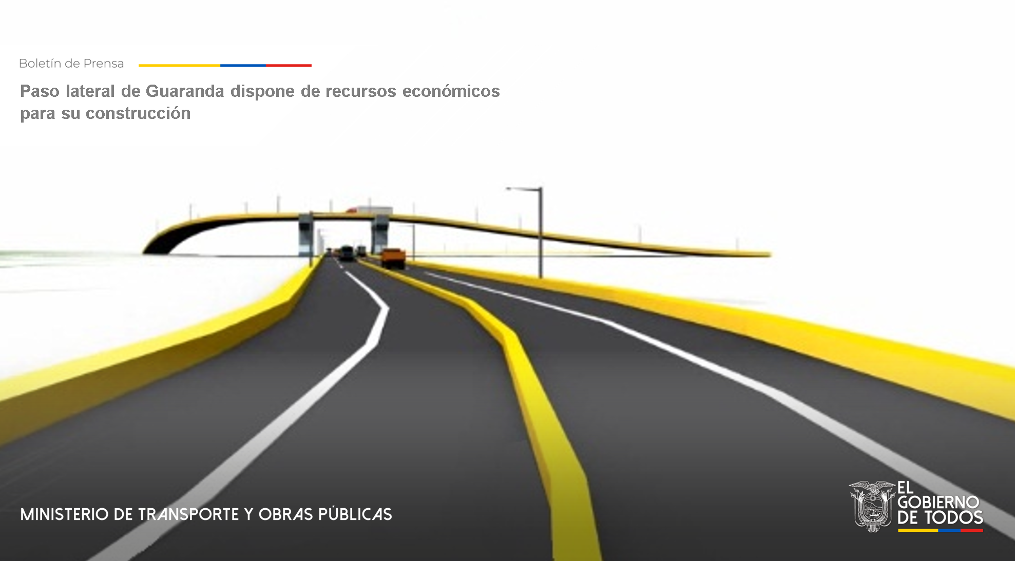 El ministro de Transporte y Obras Públicas, Gabriel Martínez, informó que los recursos económicos para construir el paso lateral de Guaranda, cuya inversión asciende a USD 43 millones, están asegurados en el contrato suscrito el año pasado con la empresa CRCC-14TH Bureau Group Ecuador. El financiamiento proviene del Banco de Desarrollo de la República Popular China.