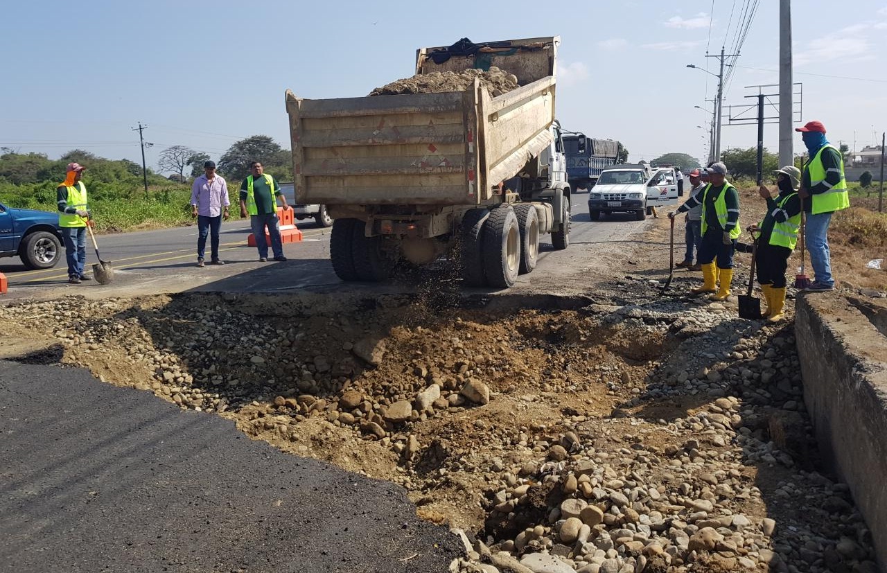 Personal del Ministerio de Transporte y Obras Públicas (MTOP), realizan trabajos emergentes en el km 54 de la vía E- 25, tramo Babahoyo – Guayaquil, en el sector conocido como la Elva, cerca al cantón Jujan, provincia de Los Ríos, el colapso de una alcantarilla provocó un socavón en el asfalto de esta carretera.