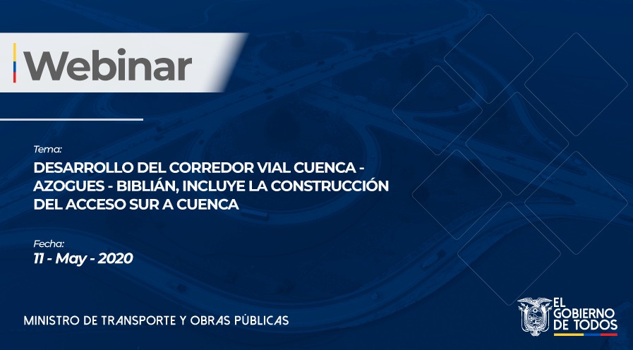 La mañana de este lunes 11 de mayo de 2020, se desarrolló un encuentro virtual entre funcionarios del Ministerio de Transporte y Obras Públicas (MTOP) e interesados en invertir en el proyecto «Desarrollo del corredor vial Cuenca – Azogues – Biblián, que incluye el nuevo acceso sur a Cuenca», esto como resultado de la convocatoria para presentar propuestas financiera realizada el pasado 7 de mayo.