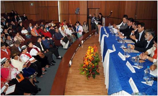 Cerca de 400 delegados de los pueblos y nacionalidades indígenas se congregaron en el salón auditorio del Ministerio de Transporte y Obras Públicas y manifestaron su apoyo al Diálogo Nacional convocado por presidente de la República, Rafael Correa Delgado y su oposición al anunciado paro de actividades convocado por el FUT y la CONAIE. También expresaron sus necesidades relacionados con vialidad, transporte y recursos hídricos que, a pesar de ser atendidos por el presente régimen, aún existen demandas sociales en dichas comunidades de la Costa, Sierra y Amazonía.