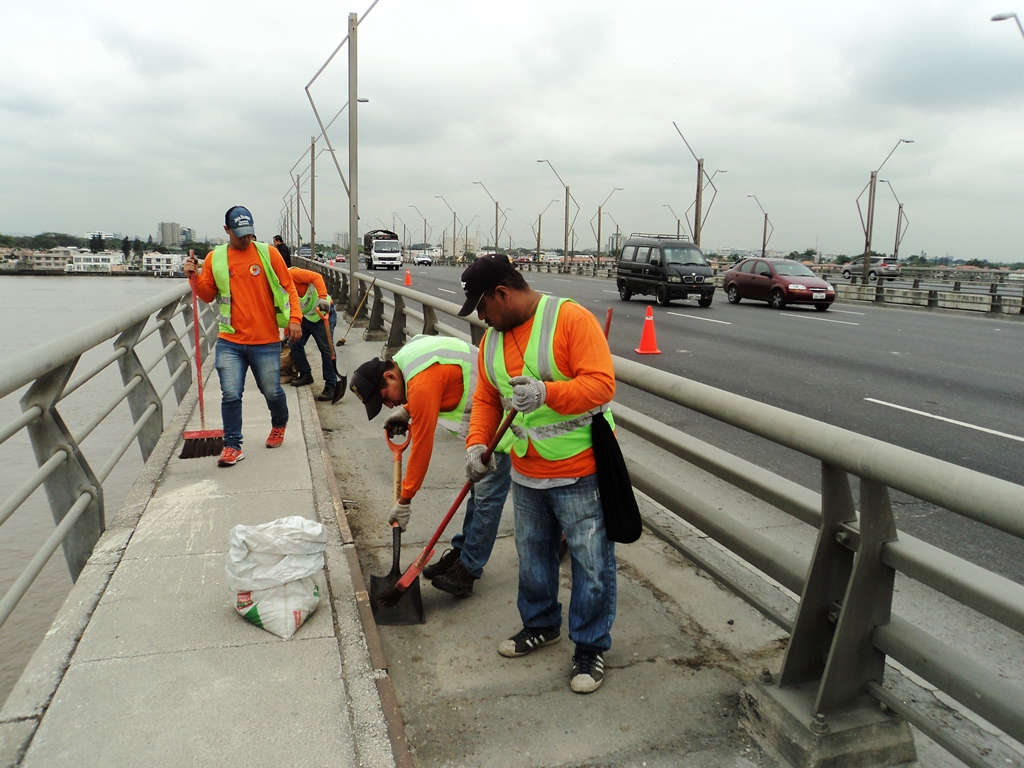 Guayas.- una cuadrilla de 12 personas integra la microempresa contratada por el Ministerio de Transporte y Obras Públicas (MTOP) para realizar el mantenimiento rutinario de los cuatro puentes del complejo vial de la Unidad Nacional, que conectan los tramos Guayaquil – La Puntilla – Durán, en una longitud de 2,5km.