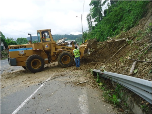 Esmeraldas.- A consecuencia de las fuertes lluvias de los días 24 y 25 de enero se registraron varios deslizamientos y derrumbes en la Red Vial Estatal de la provincia de Esmeraldas, percances que son atendidos por el equipo caminero del Ministerio de Transporte y Obras Públicas en coordinación con personal técnico de los municipios y compañías de construcción.
