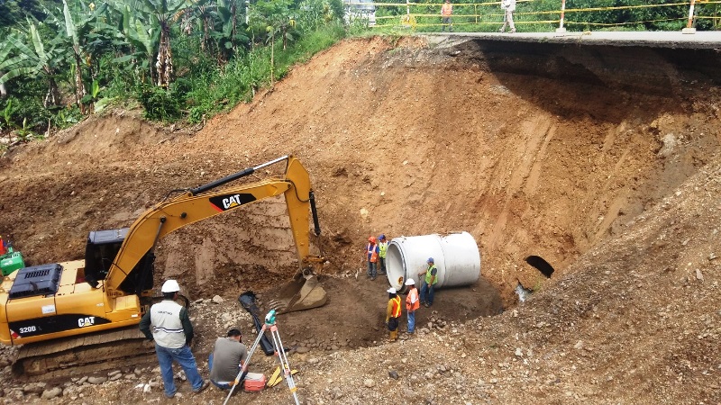 La empresa contratista encargada del mantenimiento y mejoramiento de la vía en el tramo San Francisco – Pasaje, trabaja en la colocación de geotextil, material de mejoramiento y tubos de cemento, a fin de restituir la alcantarilla colapsada. Entre tanto, un carril se mantiene habilitado en la zona.
