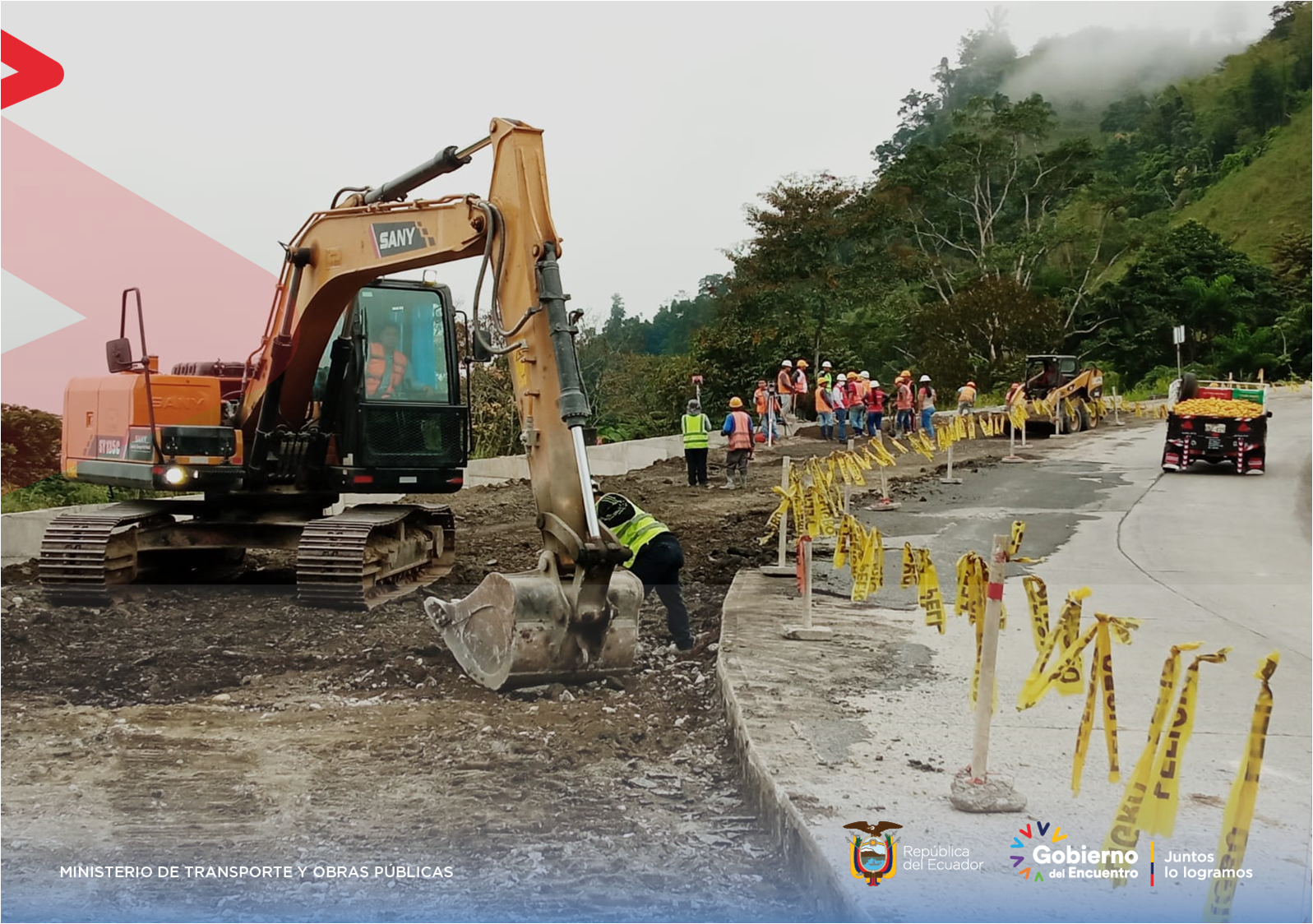 En el tramo El Carmen – Rocafuerte, sector Las Cumbres, se labora en la reposición de paños de hormigón y, entre el sector Dos Caminos hasta La Sequita en la ruta Tosagua – Rocafuerte (E38), se efectúa el tendido y compactado de material. Además, se cumple el control de tránsito y polvo para mitigar las afectaciones.