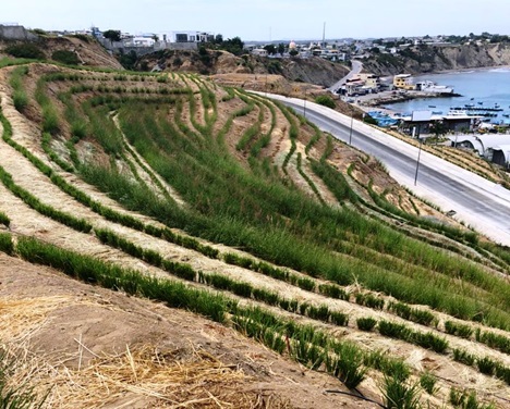 Julio Matamoros, director distrital del MTOP Santa Elena, explicó que en el cerro de Anconcito se sembraron 85 000 plantas distribuidas en hileras. El beneficio: asegurar la transitabilidad de los habitantes y la protección de la vía, sobre todo en época invernal.
