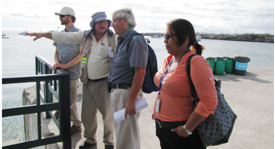 Durante el recorrido, los técnicos del área de Planificación del Gobierno Autónomo Descentralizado de Santa Cruz y del INER, a cargo del proyecto de diseño y construcción de la barcaza para pasajeros y equipaje propulsada con energía solar, revisaron la estructura de los muelles para establecer lineamientos que les permitan ejecutar la obra para que la barcaza pueda operar sin inconvenientes.